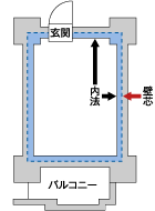分譲マンション等の区分所有建物ではパンフレット等に記載されている専有面積と登記簿上の面積(登記床面積)は異なります。パンフレットの専有面積は壁の中心(壁芯)を基に計算をしますが、登記床面積は内法(うちのり)によって計算をします。従って登記床面積はパンフレット上の専有面積より少ないことになります。