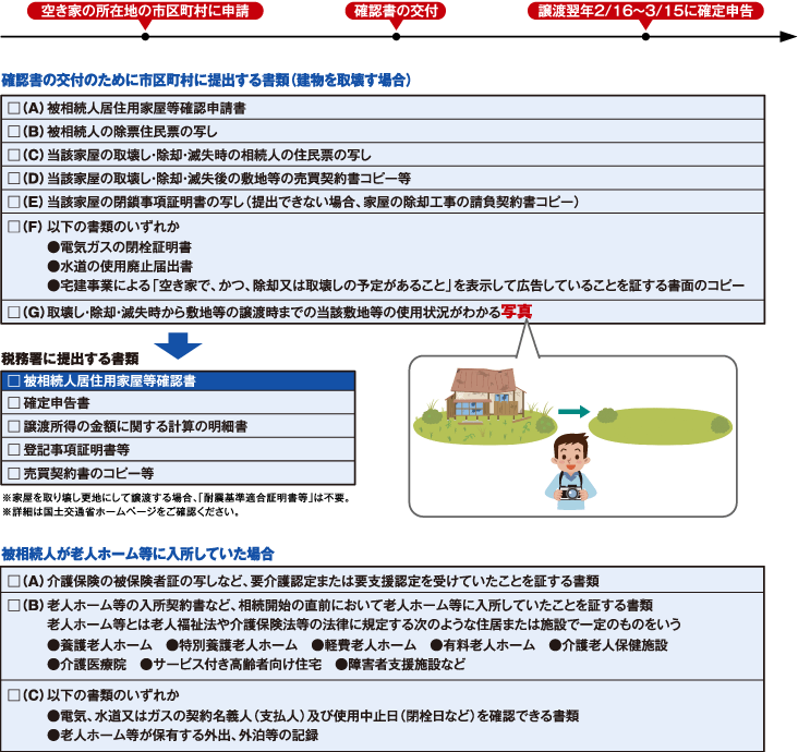 2段階で申請します。まず空き家の所在する市区町村で空き家の確認書を発行してもらいます。その確認書を確定申告に添付して税務署に提出します。