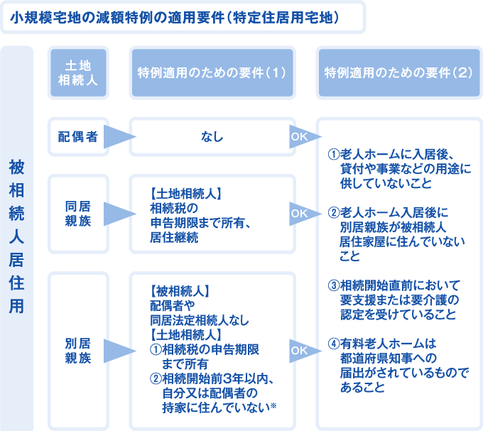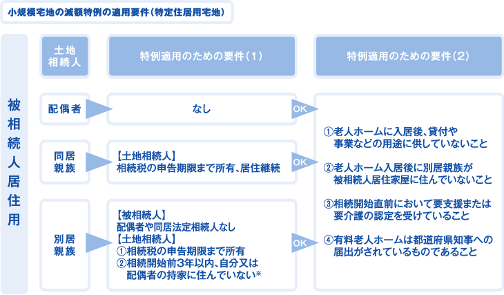 以下特例を受けるための要件(1)及び(2)を満たした場合には小規模宅地の評価減の特例を適用することができます。