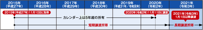 2015年(平成27年)11月10日に購入した資産を2020年(令和2年)11月11日に譲渡した場合、11月11日で満5年を超えても、譲渡した2020年(令和2年)の1月1日で5年を超えなければ長期譲渡所得となりません。2021年(令和3年)1月1日以降に譲渡した場合に長期譲渡所得となります。