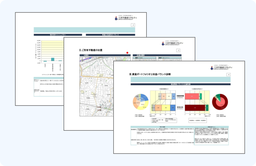 お客様が所有する不動産資産の現状を客観的に分析し、課題を把握したうえで、税理⼠や弁護⼠などの専⾨家と連携して、資産組み換え‧有効活⽤‧相続対策‧売買‧賃貸などの課題解決のサポートをします。