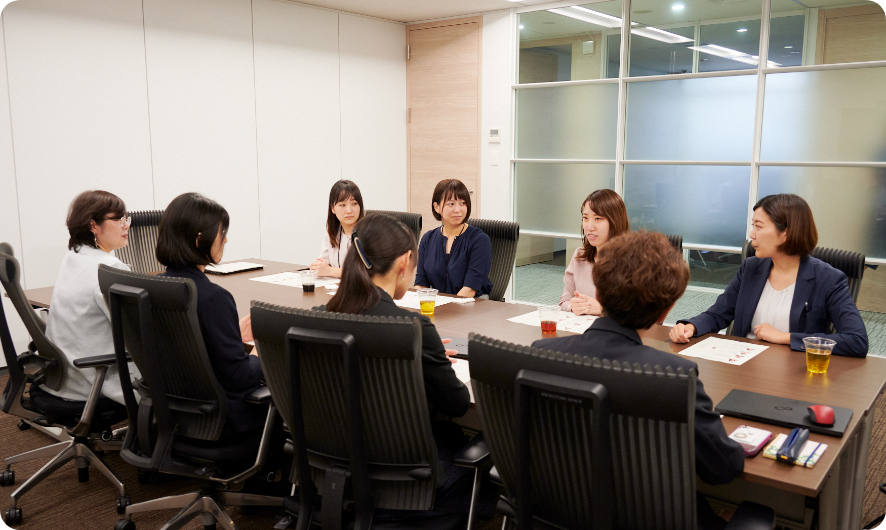 当社を「よりチャレンジングな仕事をしたい」「そのためのキャリアをつみたい」と思える職場、組織にしていくため、定期的に集まり、制度導入に関する提言や、女性社員に対する支援などを行っています。