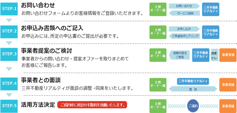 土地所有者さまは「ALZO」のサービスを通じて、幅広い事業者から土地活用の提案を受けることが可能となります。また、当社の担当者による提案の取りまとめ、交渉、契約までの総合的なサポートやアドバイス(賃貸仲介)を受けることができます。