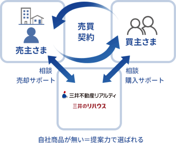 不動産流通の仕事は、例えば不動産売買の場合、売主さまの売却条件と買主さまの購入条件を整理し、お互いをつなぎ、不動産売買取引のサポートをする仕事です。自社商品が無いことから、お客さまに選ばれるためには提案力(コンサルティング能力)が重要となります。また、お客さまに寄り添って、一緒にお客さまの「こたえ」を見つけていく仕事という点に特徴があります。