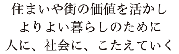 私たちの使命は、お客さまの抱える"すまい"や"くらし"の様々な課題について解決のお手伝いをすることで、暮らしと社会を広く継続的に支えていくことです。私たちは住まいや街の価値そのものを産み出すことはできませんが、住まいや街が持つ価値を活かしていくことで、"すまい"や"くらし"に貢献しています。私たちは、暮らしを支えることで、社会と共に成長・発展していける会社となることを目指していきます。