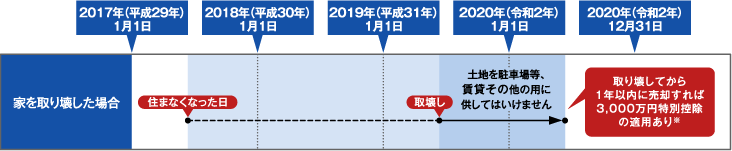 その更地の売却にかかる契約が家を取り壊してから1年以内に締結され、かつ、その家を居住の用に供しなくなった日以後3年を経過する日の属する年の12月31日までに売却すれば、家がなくとも3,000万円特別控除は適用することができます。なお、更地となった後については駐車場等、賃貸その他の用途に供してはいけません。