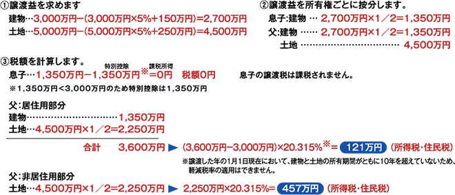 以前から父が所有していた土地(所有期間10年超)に2014年(平成26年)11月に完全分離型の二世帯住宅を建築し、父と息子で区分所有して居住しております。2020年(令和2年)2月に8,000万円で売却(建物対価3,000万円、土地対価5,000万円)しました。取得費については不明で計算します。