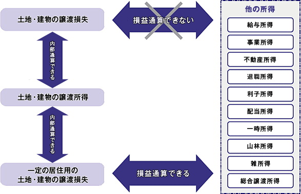 土地・建物等の長期譲渡所得の金額の計算上生じた損失の金額および、土地・建物等の短期譲渡所得の金額の計算上生じた損失の金額については、原則として土地・建物等の譲渡による所得以外の所得との損益通算および翌年以後の繰越は認められません。また、土地・建物等の譲渡による所得以外の所得の金額の計算上損失が生じた場合には、土地・建物等の長期譲渡所得の金額および、土地・建物等の短期譲渡所得の金額との損益通算も認められません。一定の居住用の土地・建物の譲渡損失については、特例として他の所得との損益通算と繰越控除ができます。