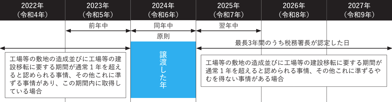 ※1 地域再生法の集中地域以外の地域から集中地域への買換えについて、課税の繰延割合が75%[東京都の特別区の区域への買換えの場合には70%]に引き下げになります。また2024年(令和6年)1月1日以後の、本店又は主たる事務所の所在地の移転を伴う買換えについての課税の繰延割合は、東京都の特別区の区域から地域再生法の集中地域以外の地域への買換えの場合は90%、地域再生法の集中地域以外の地域から東京都の特別区の区域への買換えの場合は60%となります。