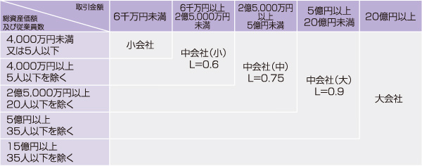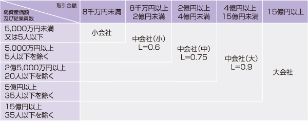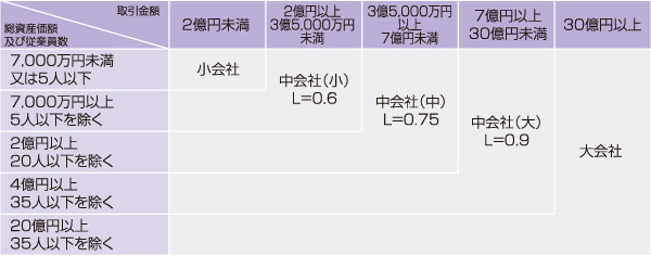 ②従業員数70人未満の会社は下記の基準に従って判定します。なお、「取引金額」と「総資産価額及び従業員数」の区分が異なる場合には、いずれか上位の会社となります。