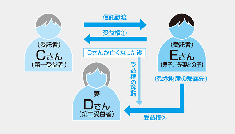 委託者をCさん、受託者をCさんの子供であるEさん、信託財産を自宅として、CさんとEさんとの間で信託契約を締結します。受益者については、Cさんが生きているうちはCさんを受益者とし、Cさんが亡くなったらDさんを受益者とします。Dさんが亡くなったら信託が終了し、信託終了後の残余財産(自宅)の帰属先をEさんにしておけば、Dさんは、Cさんが亡くなった後も引き続き自宅に住み続けることができ、Dさんが亡くなった後はEさんが自宅を引き継ぐことができます。